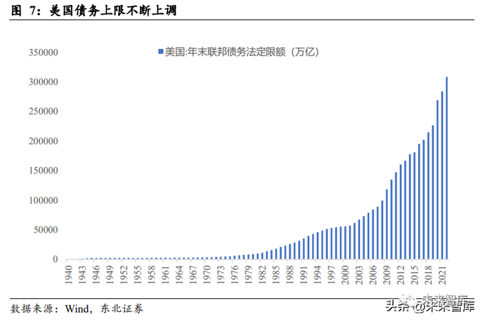 往后看,货币超发已覆水难收,且财政赤字货币化带有很强的成瘾性,未来每当危 机出现时,大概率都会出现一次货币放水,全球信用货币贬值难再回头。2008 年金融危机后全球经济已陷入低迷期,再加上民粹主义抬头,各国政府倾向于 采用更积极的财政政策来刺激经济(本质上是用政府杠杆替代居民杠杆),因而财政 赤字需要不断扩张、美国需要一次次地提高债务上限。同时政府债务又对货币政策构成隐性制约——需要央行创造低利率的融资环境,同 时也需要央行配合购买政府债务,而央行的购债扩表行为,也将必然带动货币泛滥。