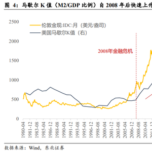 2008 年金融危机后,全球货币政策变为极度宽松,美联储大幅扩表,带来了显著的 全球货币超发(M2/GDP 比例自 2008 年后快速上升),推动信用货币整体贬值,大 宗品价格和各类资产价格暴涨则是这种贬值的反映,这也再一次推升了金价中枢。值得注意的是,2008 年金融危机后,美元指数与金价的相关性开始明显弱化。例如 2008-2011 年美元指数停止下行,转为震荡上涨,但金价仍在继续走高。这某种程度上意味着:黄金和美元的对立,更明显地转变为了黄金和整个信用货币 体系的对立,汇率这一维度的重要性有所减弱,很多时候美元指数强,并非说明美 元强大,而只是信用货币集体贬值的同时,欧元比美元更弱。