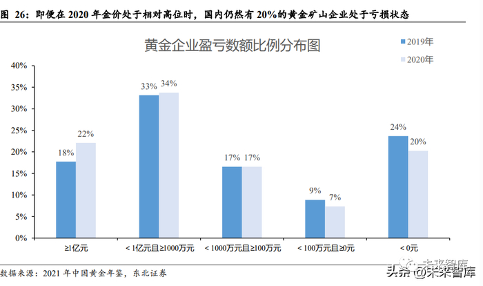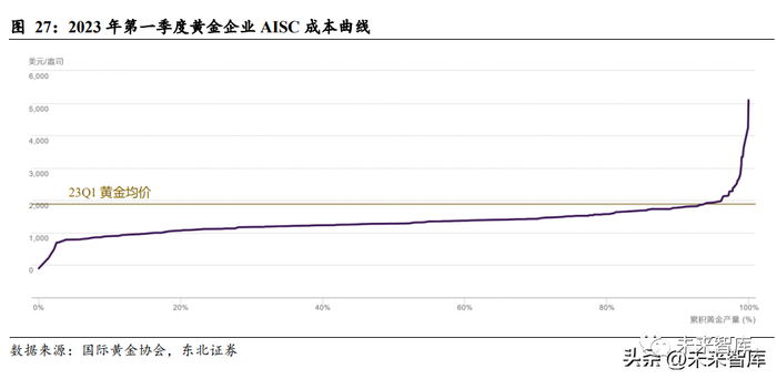 二是单位利润弹性。各黄金矿山品位、开采条件不同,因此单位成本和单位利润实际上差异很大。根据 2021 年中国黄金年鉴,即便在 2020 年金价处于相对高位时,国内仍然有 20%的黄 金矿山企业处于亏损状态。再从 23Q1 全球金矿企业 AISC 成本曲线来看,目前 80% 部分金矿成本在 1000 美元/盎司+,金价 2000 美元/盎司下,1000 美元成本和 1500 美元成本对应的利润大致差了一倍。从 A 股上市公司来看,在沪金价格接近 400 元 /克的下,单位利润约在 50-200 元/克不等,差异实际较大。对于单吨利润更低的矿山而言,其实在金价上涨周期下具备更大弹性,另一方面, 如果矿山能够实现降本(提高品位、改善运营),则也能带来不错的利润弹性。