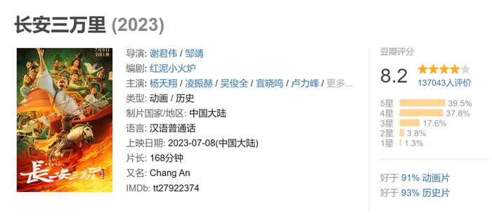 据灯塔专业版实时数据,截至7月15日15时17分,影片《长安三万里》票房突破5亿。其豆瓣评分也从上映之初开分8.0升至8.2,成为暑期档评分最高的国产院线影片,也是出品方追光动画至今评分最高的一部作品。