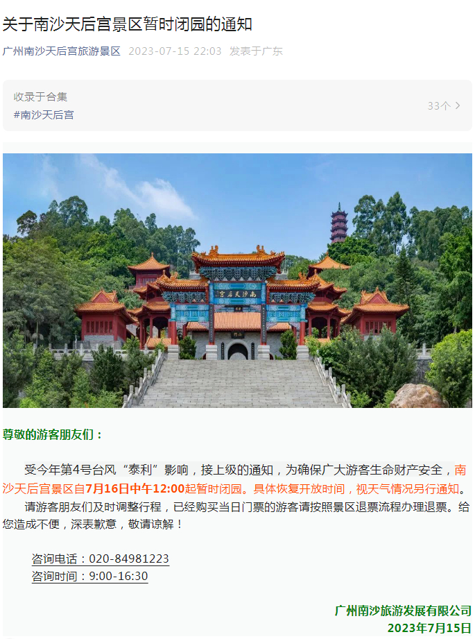受今年首个登陆我国的台风“泰利”影响,广州南沙天后宫、深圳大梅沙海滨公园、惠州海龟湾、茂名中国第一滩等多家景区发布7月15日或16日起临时关闭通知。