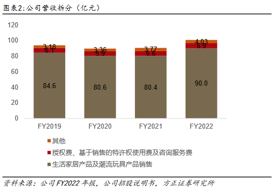 公司主要营收来源为生活家居及潮流玩具产品销售。公司通过轻资产模式快速扩张,大量开设合伙人门店和代理门店,通过一定的分成协议从门店开设与产品销售中获益。从FY2022的数据来看,公司90%左右的营收来自于生活家居及潮流玩具产品销售。