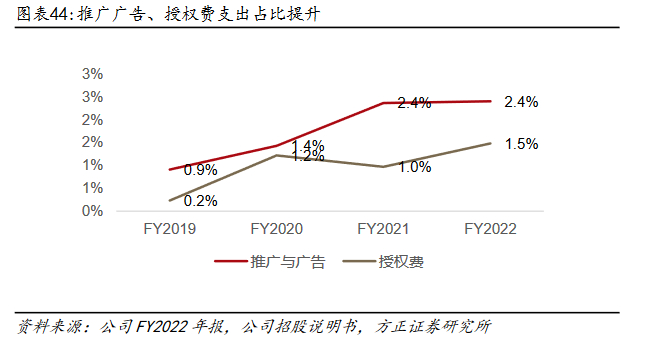 毛利率:23年疫情放开后有望提升国内线下店效,同时预计23年2月24日的品牌升级将在FY2023的后半年快速提升国内毛利率,而海外随着开店规模不断增长,将有望改善盈利能力,驱动毛利率上行。以上两个因素会驱动整体毛利率上行,预计FY2023-FY2025毛利率37%/38%/39%。