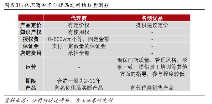 在代理模式下,名创优品对代理商的运营参与程度较小,具体体现为不提供管理和咨询服务,且代理商以买断的形式进货,在代理商模式下,名创优品会和代理商约定一定的绩效目标,代理商通常需要按协议在约定的时间内在许可地区内部开设一定数量的名创优品门店。