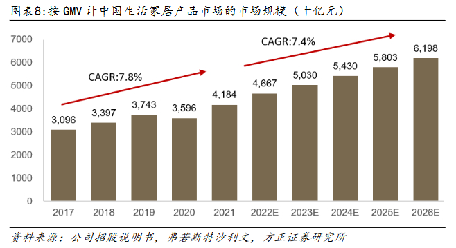 生活家居产品市场规模超过4万亿。根据弗若斯特沙利文报告,按GMV计,中国生活家居产品市场的规模由2017年的人民币3.1万亿元增至2021年的人民币4.2万亿元,年复合增长率为7.8%,为所有零售分部中增长最快的市场之一。