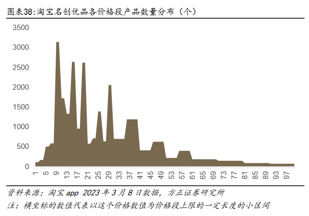 打造高性价比产品,定价偏向大众。据我们在淘宝app中获取的数据,名创优品的产品密集集中在50元以下价位段,定位非常大众化。下图的绘制方法为:30元以下用2元一个价位段取平均值,30元-60元用5元一个价位段取平均值,60元以上以10元一个价位端取平均值。平均值的计算方法为该价位段内的产品数量/价位段长度。
