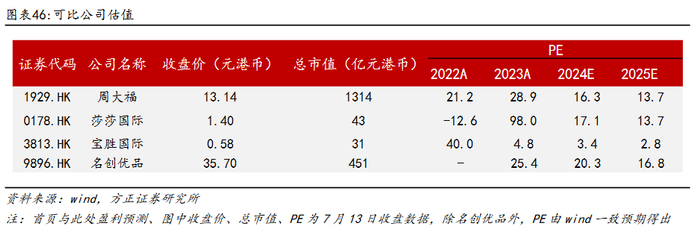投资建议:名创优品的极简品类赋予了公司更为强的增长势能,公司以数字化赋能全流程,以高效的品类迭代来持续吸引终端消费者,其轻资产模式结合自身的品类能力、数字化能力后,有望继续在国内进行门店加密,实现较快速扩张。而在品牌升级的带动下,公司以一个低价品牌的姿态逐渐向上探索更多的内容附加值可能性,持续提高公司的盈利能力。综合考虑公司现状,预计公司FY2023/FY2024归母净利润16.23/20.29亿元,对应25x/20x PE,给与公司FY2023年33倍PE估值,对应目标市值586亿港币,目标价46元港币,首次覆盖,投资评级为“强烈推荐”。