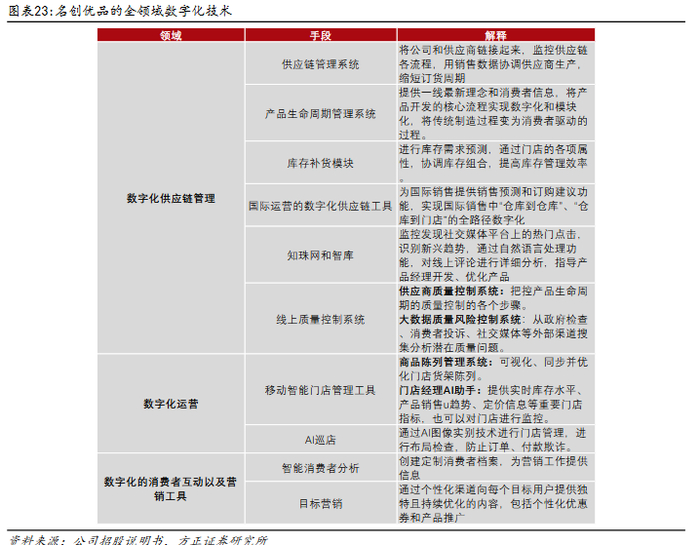 名创优品的数字化能力全面覆盖了设计、生产、供应链、运营、营销、售后的各个环节。如下图所展示的,名创优品的数字化技术在产品设计阶段就开始为产品经理提供信息支持,在生产、库存、质量控制等供应链领域做到了全数字化,而公司的数字化系统还可以赋能门店运营管理以及消费者营销,实现全流程的数字化。