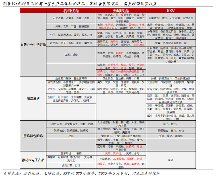 名创选的大部分产品由于品类特性,单品本身很难通过差异化的产品力或者品牌力构建壁垒。名创优品选的产品是相对最难构建起差异化产品力或品牌力的,如下图所示,我们认为,至少在标红的类目下,是存在一定差异化产品力构建空间的,或者至少已经存在一个较为知名的品牌。而名创优品选的产品品类由于产品自身的特性,在产品本身很难构建起产品力差异,历史上也基本不存在较强品牌,基本不需要直接和大品牌进行竞争。