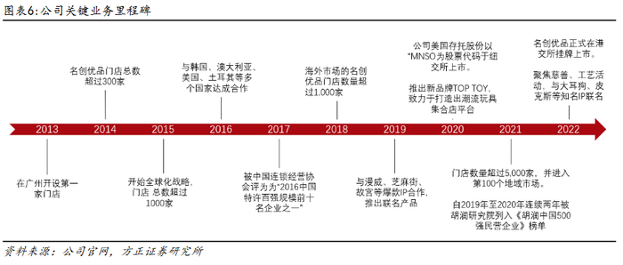 2018至今:多渠道发展,持续与各大IP与品牌合作。公司打通线上和线下的新零售渠道,不断与各大IP与品牌合作,如漫威、芝麻街、故宫。
