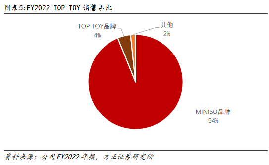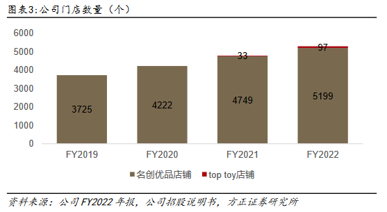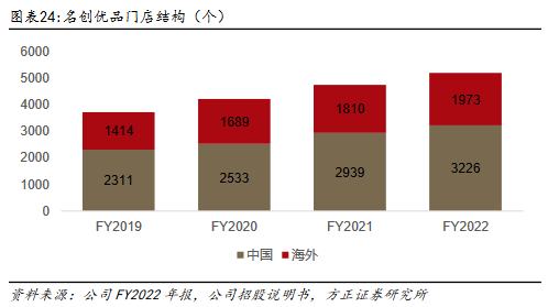 名创优品门店持续扩张。公司在国内外都有大量名创优品门店,即使在疫情期间,公司也在持续快速扩张。截至FY2022,公司共有5199家名创优品店铺,97家top toy店铺,下图中展示了公司国内外名创优品店铺的拆分。