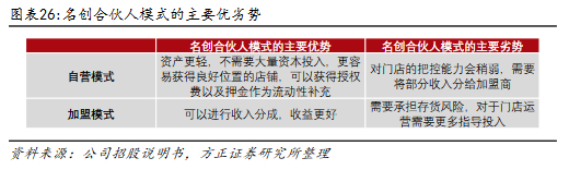 名创合伙人承担开店投入,名创优品公司提供管理咨询服务。在名创合伙人模式下,名创合伙人会承担所有的开店费用投入,而名创优品公司主要以管理咨询的形式输出管理经验、品牌、招聘、门店设计等方面的经验,双方共同进行收入分成。概括而言,一个加盟商只需找好铺位、准备开店的资本支出,再和名创优品签订协议即可,后续的管理全部由名创优品负责,加盟商相当于“财务投资商”。