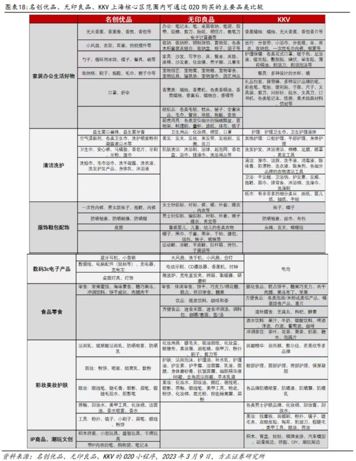 作为横跨多个产品类目的公司,名创优品的品类具备特色,本节进行了详细对比。本小节先整理类目进行对比,后三节详细说明。本文的对比分析以手机定位在上海静安核心区后,各家O2O小程序内显示的目前可销售/可快递送达的无印良品、名创优品、KKV商品选项作为样本。我们认为,上海作为我国经济发达的一线城市,在此城市可通过O2O渠道/快递渠道购买的商品通常具备一定的标杆性,在较高的经济水平支持下,商品品类丰富度也相对高且全面,贴近具体渠道的真实情况。具体对比如下图: