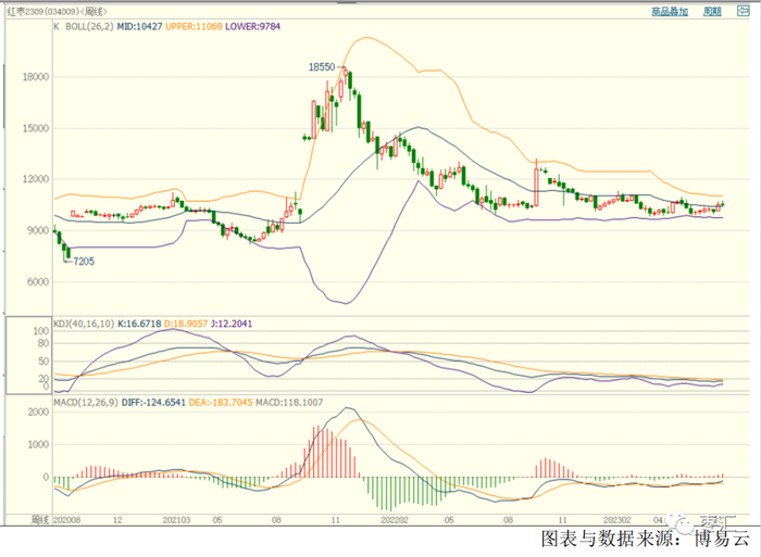 郑枣主力2309合约,周五收盘报10540元/吨,周内期价下跌40元/吨,持仓量43426手,较上周减少522手。技术上,周线收于布林通道中轨只上,MACD红色能量柱放量,KDJ指标在零轴下方缠绕。