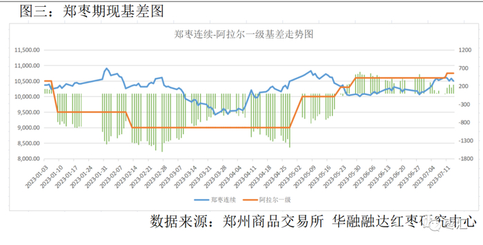 7月14日,阿拉尔灰枣一级与郑枣期价基差为250元/吨,较上周相比基差大幅走强。