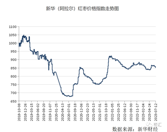 截至7月13日,新华(阿拉尔)红枣价格指数报857.02点,周环比微幅下跌0.20%,分地区看,新疆产区红枣价格指数周环比下跌0.25%,批发市场红枣价格指数周环比下跌0.18%。