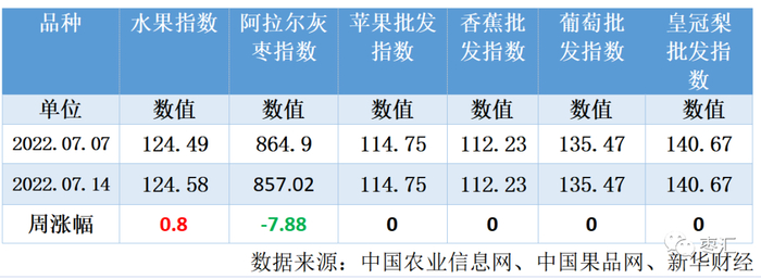 水果指数较上周相比微幅上调;灰枣指数较上周下跌;香蕉批发指数较上周持平;苹果批发指数本周较上周持平;葡萄批发指数较上周持平;皇冠梨批发指数较上周持平。