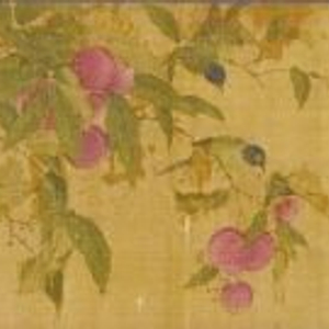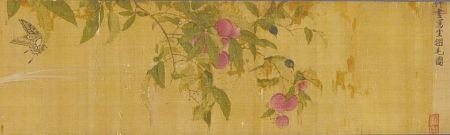 爱荔枝的食客们不仅写诗文赞叹荔枝,也用妙笔丹青描绘荔枝。传为宋徽宗所绘的《写生翎毛图》便生动地描绘了荔枝成熟、鸟儿垂涎欲食的趣味场景。画家对荔枝的刻画极其细致,观者可以清晰地看到每一颗荔枝上大小不一的凹凸斑点。荔枝的大小、颜色、形状、姿态、方向、位置、成熟状态各不相同,硕大的果实掩映在树枝绿叶间,让人感受到果实成熟的喜悦,甜美的果实气息从画面中飘来。羽毛亮丽的鸟儿看着枝头硕大的果子,早已垂涎三尺,它们张嘴鸣叫,似乎在和同伴商量如何啄破荔枝坚硬的外皮。蝴蝶翩翩起舞,栀子花迎风怒放,共同呈现出夏天自然界的魅力风姿。宋徽宗主张状物精细入微,注重表达自然的生机,从这幅画中,我们可以感受到他鲜明的绘画风格,穿插有致的物象间洋溢着迷人的自然生趣。