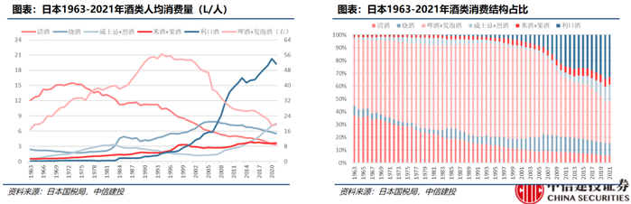 1.酒类:1996年总销量见顶,价格升级与价格降级并存。(1)清酒:1974年销量见顶后价增持续近30年,1970-2000年价格上涨近2倍。即使在经济低迷期,清酒消费结构仍然持续升级,作为社交品的高端清酒仍具备需求刚性,高端清酒稳健增长。清酒市场格局较分散,CR5约27%,在原材料和生产工艺的定价模式下未走出大市值公司。(2)烧酒:凭借性价比替代清酒和威士忌,在90年代快速增长并持续至2007年,1990-2007年销量CAGR为4.3%,近20年价格保持平稳,竞争格局较集中,CR3约51%。(3)威士忌:销量1983年见顶,先后经历受税率改革、进口冲击、经济衰退等多重影响,持续下滑至2008年降幅约78%,2008-2019年逐步复苏CAGR约7.8%。(4)啤酒:1994年销量见顶后被税负较低的发泡酒、第三类啤酒等替代,整体价格保持平稳,其中餐饮端啤酒价格保持温和上涨,21年较1999年上涨约17%。即使在啤酒类整体低价化趋势下,高端啤酒占比仍有提升。格局呈现寡头垄断,麒麟朝日双雄并立。(5)利口酒、果酒:2011年后女性就业增加驱动二次成长,2011-2021年女性就业人数累计增长13%,同期果酒销量累计增长22%,CAGR约2.0%。