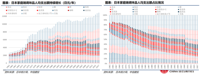2.调味品:健康化与功能化并行,结构持续升级。(1)酱油:1973年销量见顶后价格持续提升,至21年销量下滑46%,而21年均价较1980年上涨约55%,健康化、功能化驱动产品升级,龟甲万龙头地位稳固,CR3约53%。(2)复合调味品:复合调味酱汁持续替代传统基础调味品,1987-2021年日本家庭端复合调味酱汁人均支出CAGR为3.2%,速溶汤料、香鬆等日式复合调味品在80年代后持续增长。(3)食醋:人均消费量在2004年见顶,至21年累计小幅下滑约6%,近20年价格表现平稳,竞争格局集中,味滋康市占率超50%。