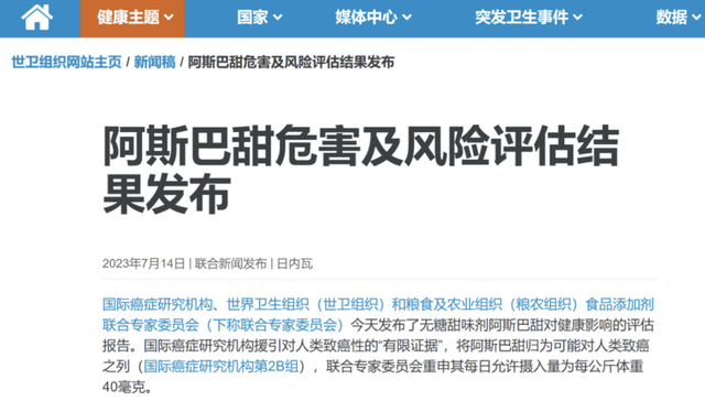 7月14日,世界卫生组织官网宣布,国际癌症研究机构援引对人类致癌性的“有限证据”,将阿斯巴甜正式归为可能对人类致癌之列(国际癌症研究机构第2B组),联合专家委员会重申其每日允许摄入量为每公斤体重40毫克。