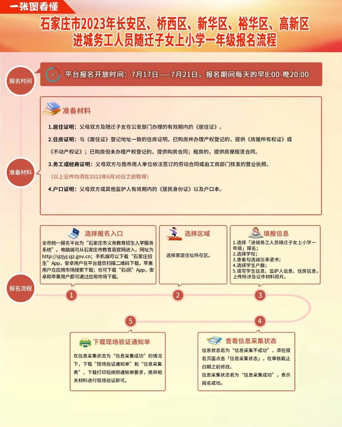 按照《石家庄市2023年义务教育招生入学工作实施方案》文件要求,长安区、桥西区、新华区、裕华区、高新区进城务工随迁子女上小学一年级网上报名工作将于7月17日—7月21日进行。在此,石家庄市教育局发出五条温馨提示。