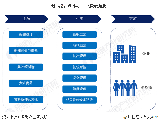 中国海运产业的上游包括船舶与集装箱等运输设备的设计、制造、维修,大宗商品的生产,以及运输所需的物料备件的制造;中游包括船舶和港口的运营、航次管理与航线开拓、安全管理、船员管理、相关设施租赁等领域;下游则主要是有贸易与运输需求的企业。