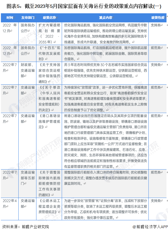“十四五”时期,我国海运行业要紧紧围绕“立足新发展阶段、贯彻新发展理念、构建新发展格局”要求,对标“四个一流”,以国家高等级航道和主要港口为主体,重点在“补齐短板、促进融合、提升服务、强化创新、绿色转型、深化改革”上下功夫。截至2023年5月我国海运行业重点政策如下: