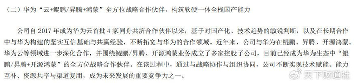 根据拓维信息2022年年报,其自2017年成为华为云首批4家同舟共济合作伙伴以来,基于对国产化、技术趋势的敏锐判断,以及在长期合作中与华为构建的坚实互信基础与共赢经验,不断拓宽与华为的合作领域。