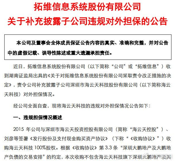 原来,海云天科技对外担保涉及的担保资产为深圳大鹏地产项目,实际归属游忠惠、刘彦等人,权属登记在海云天科技名下(拓维信息收购海云天科技时已披露该资产不属于上市公司)。