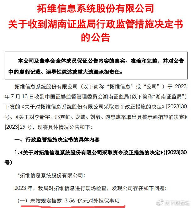 拓维信息发布公告承认:公司存在未按规定披露3.56亿元对外担保事项;未及时调整长期股权投资当期损益变动共计605万元;2021年未及时计提坏账准备64万元的问题。