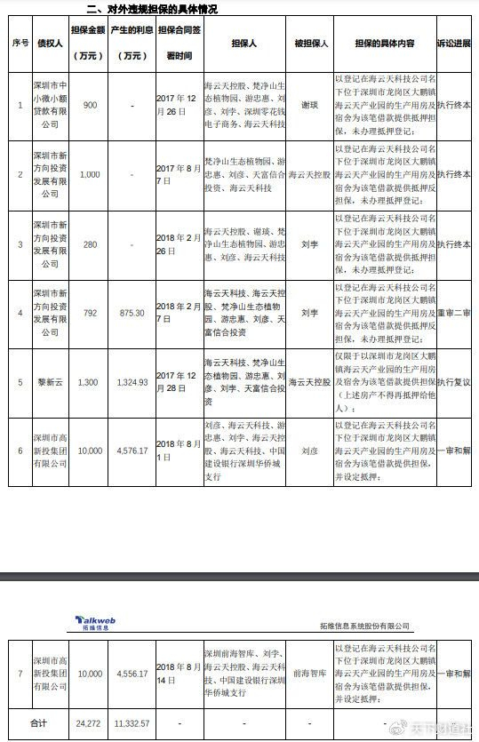 2017年至2018 年期间,游忠惠、刘彦利用海云天科技名下“深圳大鹏地产”(其控制权及所有权均不归属于海云天科技)作为担保物,为其本人及关联方借款共计提供了7项担保。