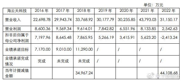 但到了2018年,海云天科技扣非归母净利润7865万元,仅完成业绩承诺的不足70%。