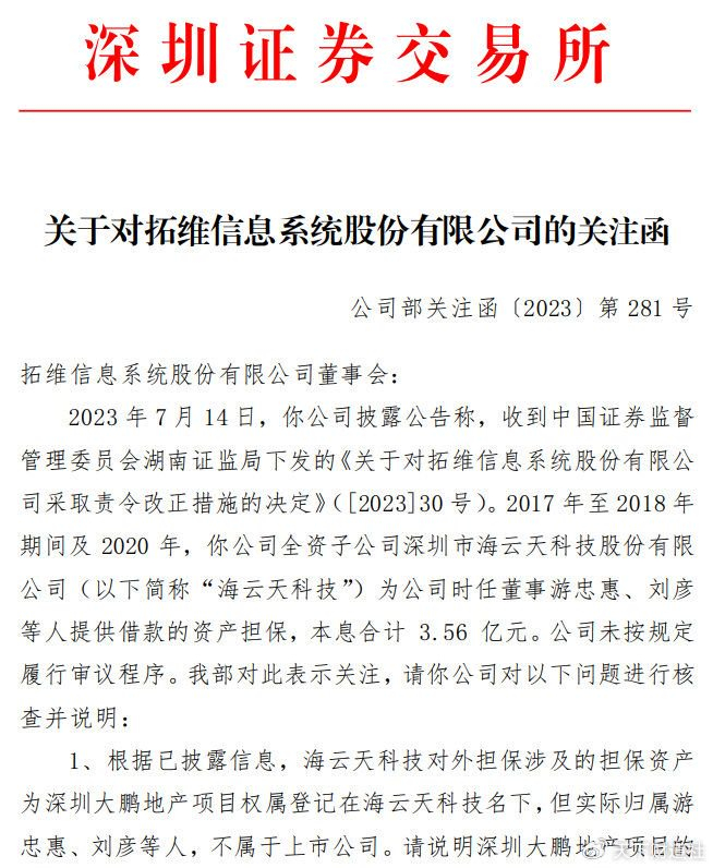 深交所要求拓维信息说明深圳大鹏地产项目的真实权属,以此形成的担保事项对海云天科技产生的影响,上述担保事项是否实质上构成违规对外担保。