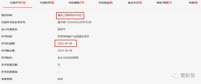 据信用中国(内蒙古包头)网站,英思特稀磁产业园建设项目于2022年5月取得了节能评估报告批复,2022年6月取得建设工程规划许可证和环评批复。