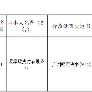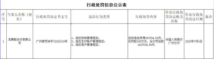 行政处罚决定书(广州银罚决字[2023]10号)显示,易票联支付有限公司存在以下违法行为:1、违反机构管理规定;2、违反支付账户管理规定;3、违反商户管理规定。中国人民银行广州分行决定没收违法所得367534.56元,处罚款105万元,合计罚没款1417534.56元。