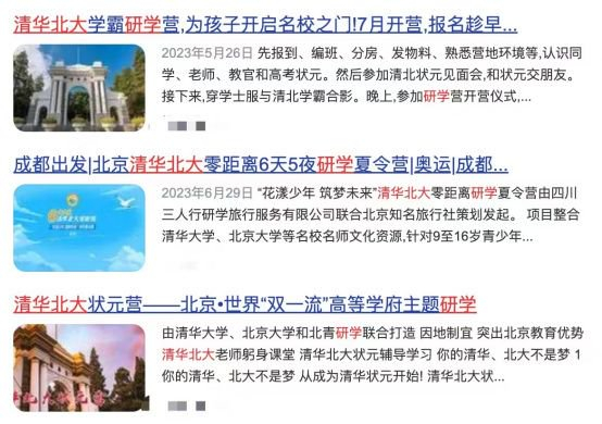 《北京晚报》曾报道,某名校暑期研学项目,广告中明确提到有北京大学的参观行程,价格高达9980元,一些家长为了让孩子接近名校,给孩子报了名。但最后却发现,这个钱花得很不值,孩子根本没进入北大校园。