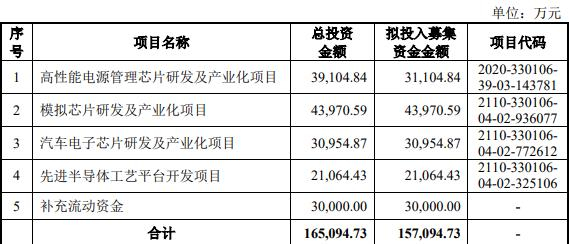 公司发行募集资金总额222214.08万元,募集资金净额为205468.49万元。据公司招股说明书显示,公司拟募集资金157094.73万元,用于高性能电源管理芯片研发及产业化项目、模拟芯片研发及产业化项目、汽车电子芯片研发及产业化项目、先进半导体工艺平台开发项目、补充流动资金。