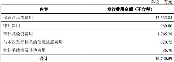 公司发行费用总额为16745.59万元,其中保荐机构中信证券获得保荐及承销费用13332.84万元。