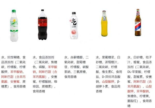 从市面上热销的饮料来看,通过配料表可以发现,人工合成代糖阿斯巴甜(含苯丙氨酸),防腐剂苯甲酸钠、山梨酸钾等添加剂加长了配料表,元气森林因不含防腐剂,配料表更短。