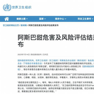 7月14日,国际癌症研究机构(IARC)、世界卫生组织(WHO)和隶属于联合国粮食及农业组织(FAO)的食品添加剂联合专家委员会(JECFA)发布阿斯巴甜危害及风险评估结果,将阿斯巴甜归为可能对人类致癌之列(国际癌症研究机构第2B组)。联合专家委员会重申其每日允许摄入量为每公斤体重40毫克。WHO组织营养和食品安全司司长表示,“对阿斯巴甜的评估表明,虽然在常用量方面安全性不是主要问题,但已对潜在影响作了描述,需要通过更多更好的研究来进行调查。”