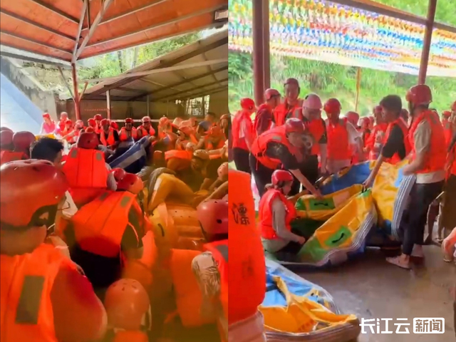 根据网友提供的视频,长江云新闻记者看到,在起漂点的领取漂流装备处,近百名游客挤在拿漂流艇的地方,几名游客为了抢夺一只漂流艇发生了激烈的言语争吵,并伴有肢体动作,差一点就要打起来。