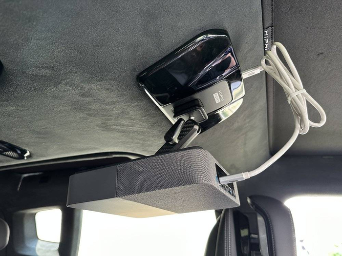 HiPhi Port高合拓展坞,被设置在HiPhi Y车内的顶棚上,并且全系标配。它具有通用型多功能附件接口及60W Type-C充电接口,用户可自由悬挂平板电脑、GoPro、投影仪等物品。