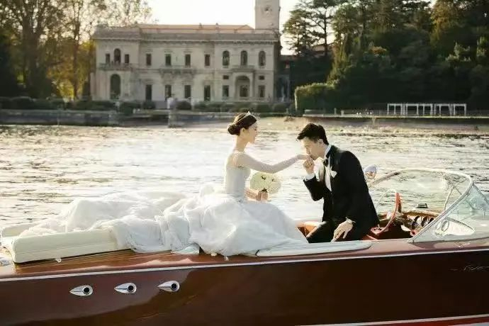 载满甜蜜新婚夫妇的爱之船从平静的湖面缓缓驶来,浪漫至极。