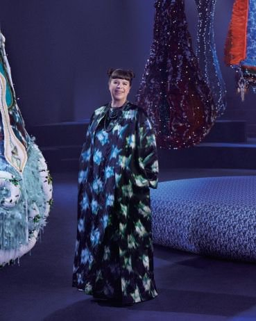 琼娜·瓦斯康丝勒以丰沛情感表达内在之美,其作品如同玛丽亚·嘉茜娅·蔻丽的设计一样,不断重塑和交融的女性气质与女性主义,致敬大胆创新的率性精神。审美是不自觉的,“误入藕花深入,沉醉不知归路”,走进大秀空间,由织物、蕾丝、刺绣和钩编制而成的作品,以浑然天成的造型悬浮并肆意延伸在秀场上空场域,仿佛在星空下翱翔,又仿佛在大海上游弋,亦仿佛将一切笼罩,覆盖观众所就座的“岛屿”,生动灵趣,斑斓多彩。