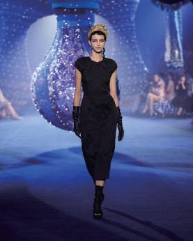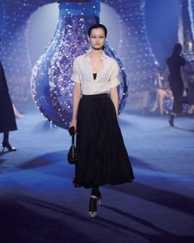 忠于自我的女性态度,从白衬衫、领带可以搭配西裤也可以搭配半裙上,从白色T恤上“JE NE REGRETTE RIEN(我一点都不后悔)”的宣言上,从佩戴璀璨金色花冠头饰配搭款式各异的小黑裙上,从褶皱面料与金属绣线巧妙交织上,从由巴黎地标性建筑埃菲尔铁塔搭配珍珠构成的配饰上,从一系列具有复古韵味的单品上……我们可以深切地感受到,迪奥为塑造新一代女性多面风范所带来的灵感与启迪。整场大秀从黑白经典走向华丽,再慢慢归于黑色经典,亦如一次次时尚的轮回,在颠覆性的创造中有认同、有致敬、有包容,亦有思考。