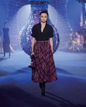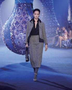 当身着标志性白衬衫与黑色半裙的模特款款走来,时装秀的大幕也正式缓缓开启,那曾属于上世纪五十年代的巴黎风韵就渐渐流光飞舞起来。经典的黑白、修身的剪裁、收腰的设计,尽情展露着女性的形体之美,唤醒了我们对最初“新风貌”(NEW LOOK)着装的记忆,是一种由内而外散发的松弛与自信。另一个唤醒对于二十世纪五十年代记忆的经典元素是迪奥先生青睐的千鸟格纹,作为品牌的经典主题,本季跃然于各种单品之上,更加实穿与新颖。除千鸟格纹之外,交织线条构成的细腻格纹也被运用在大衣、外套和裙装单品上,配以或明或暗的色彩,让格纹元素不再显得沉闷,更为随性自如,成为一种流动的实穿主义。