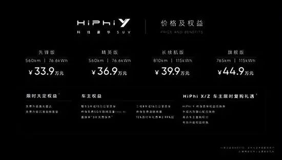7月15日,高合HiPhi Y正式上市。此次上市新车共推出4款车型,售价区间为33.9-44.9万元。新车基于H-SOA电子电气架构打造,定位纯电中大型SUV。