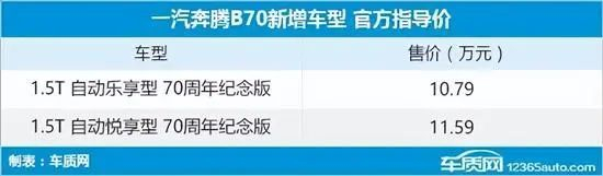 7月15日,编辑从一汽奔腾官方获悉,旗下奔腾B70新增两款70周年纪念版车型,售价为10.79万元和11.59万元。作为新增车型,新车主要在配置方面有所升级。(配图均为2.0T车型)