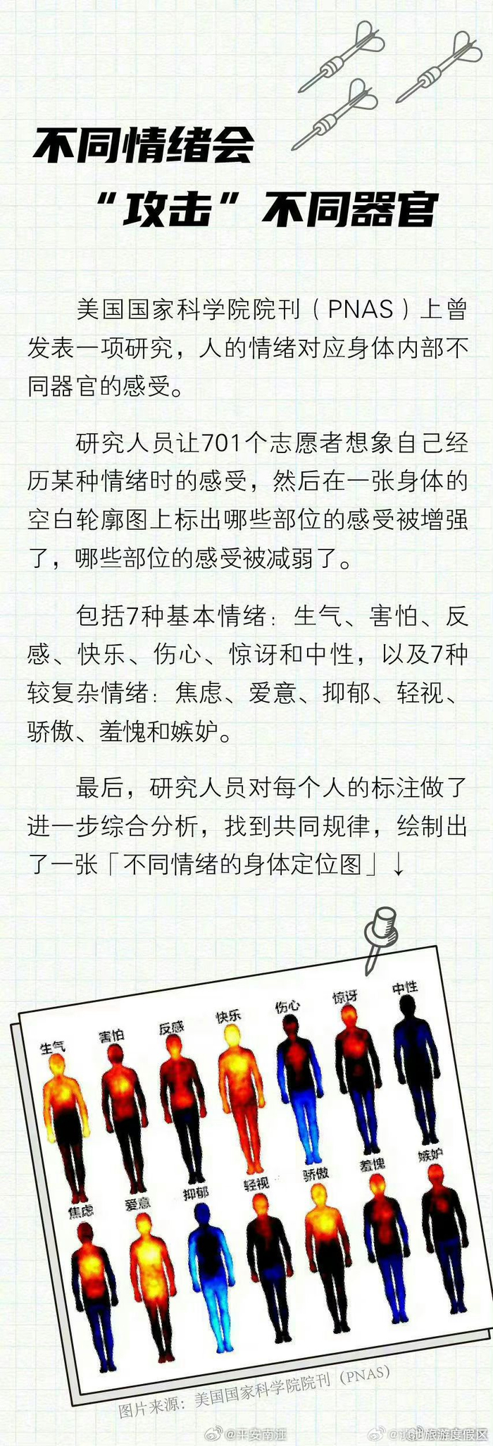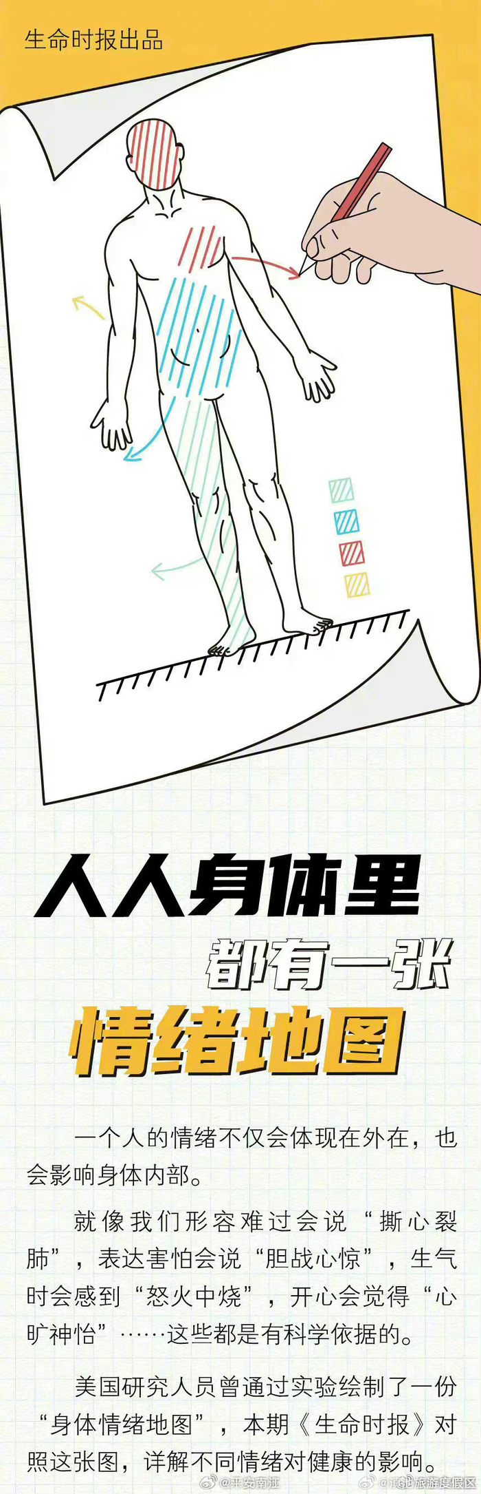 我们形容难过会说“撕心裂肺”,表达害怕会说“胆战心惊”,生气时会感到“怒火中烧”……人的身体里有张情绪地图,揭示了不同情绪最容易作用的器官和部位↓↓为什么情绪能影响身体器官?遇到情绪障碍时,如何科学应对?戳图了解↓↓(@生命时报)